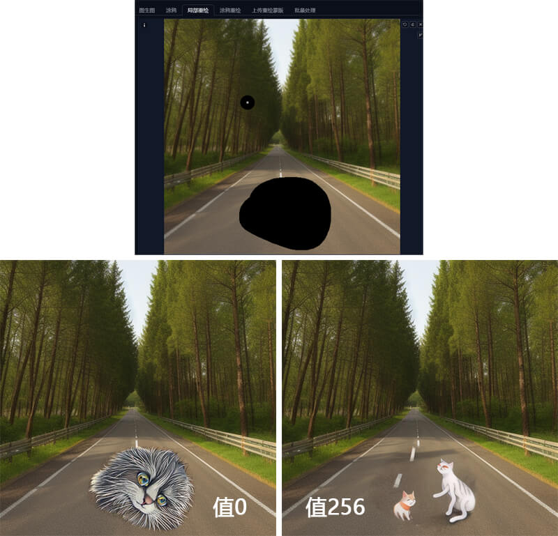 下面是在公路中央增加一只猫,“仅蒙版区域下边缘预留像素”值分别在0和256下的重绘图: