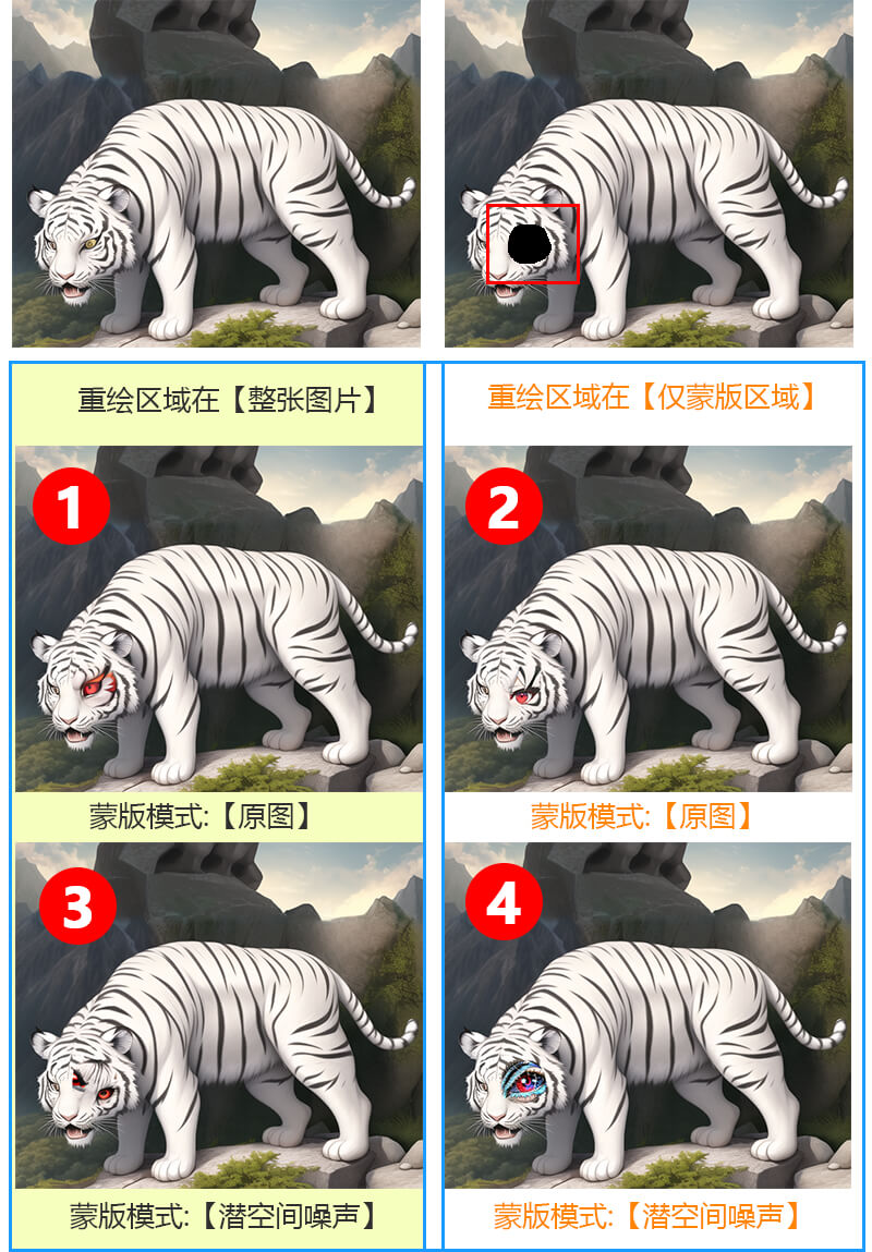 图3解析:在【整张图片】影响下,蒙版区受到全图内容影响,蒙版模式为【潜空间噪声】蒙版区处理方式为将蒙版区变成噪声后重绘,结果局部绘图会受到全图内容影响,但处理方式受蒙版区域内内容影响很小,也就是说,受全图内容影响但不受蒙版区内容影响,容易出现重叠,画出了2只眼睛。