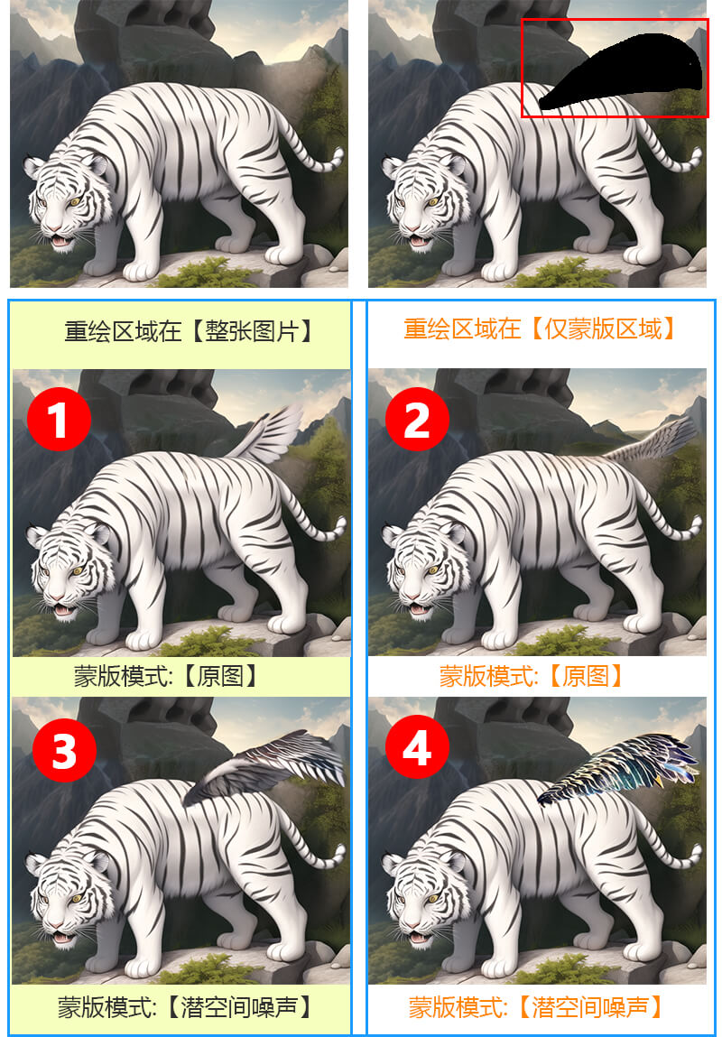 图1解析:在【整张图片】影响下,蒙版区受到全图内容影响,蒙版模式为【原图】蒙版区处理方式为以蒙版内容为基础重绘,结果绘图会参考原图和蒙版区影响,而且受蒙版区内容影响较大,但蒙版区内容更多的是石头和树木,要重绘出翅膀有点难,但最少翅膀还和身体风格很像。