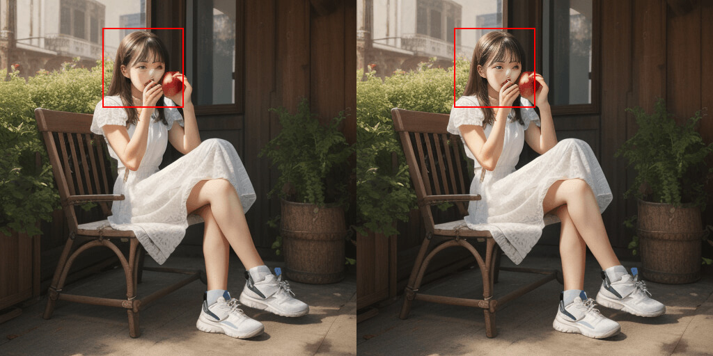 第一张是未调用面部修复,第二张调用面部修复,女孩的脸同样是扭曲的,只是稍微增加了饱和度。