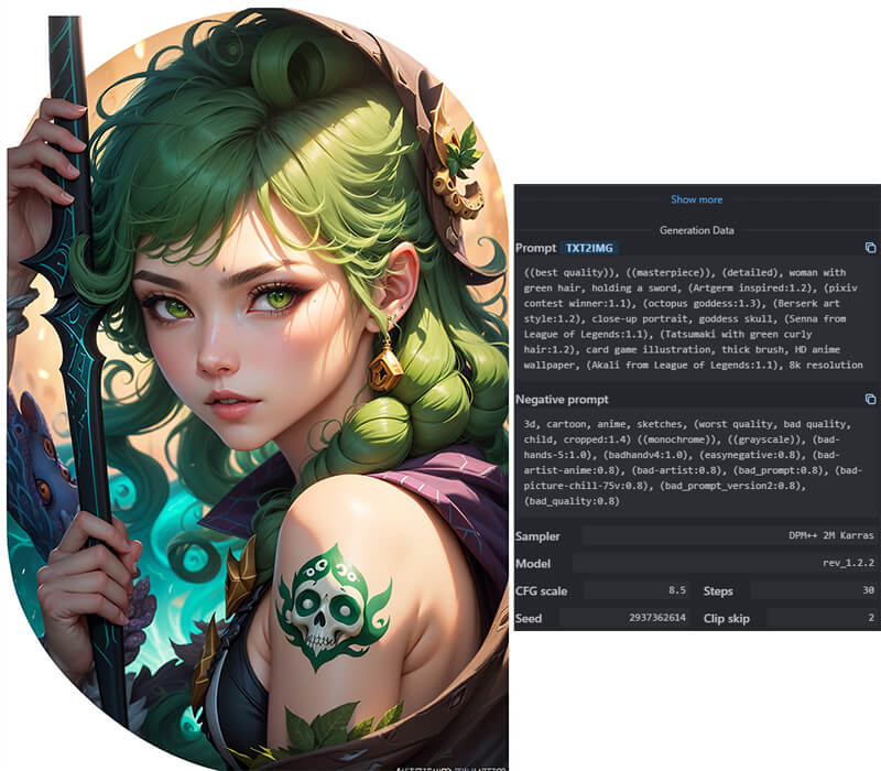 1. ((best quality)), ((masterpiece)), (detailed), woman with green hair, holding a sword, (Artgerm inspired:1.2), (pixiv contest winner:1.1), (octopus goddess:1.3), (Berserk art style:1.2), close-up portrait, goddess skull, (Senna from League of Legends:1.1), (Tatsumaki with green curly hair:1.2), card game illustration, thick brush, HD anime wallpaper, (Akali from League of Legends:1.1), 8k resolution