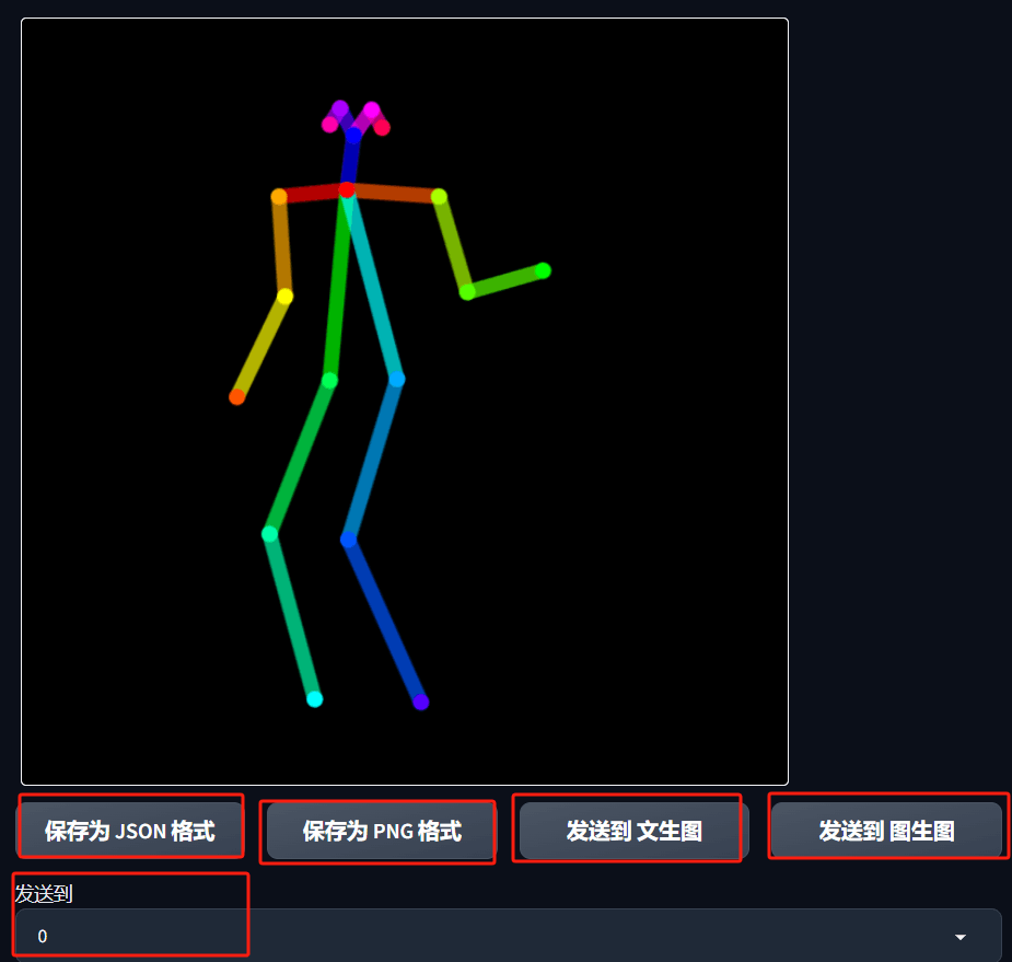 如果确定调整好骨架图后我们就可以直接把骨架图发送到文生图或图生图的controlnet底图中了,或者也可以直接保存该骨架的图片或信息,留着下次再用