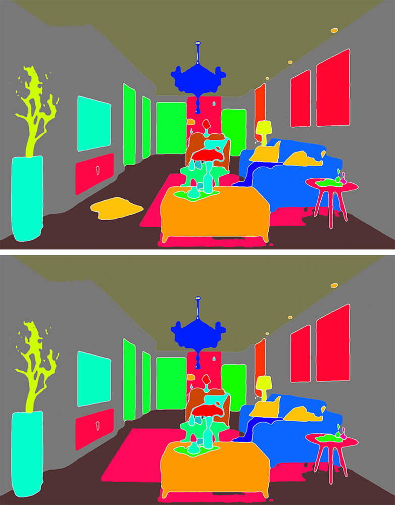 我们通过在线语义分隔,生成预处理图像,再通过PS将地毯的颜色延伸画出,把地上的抱枕用地板色补充,如下图: