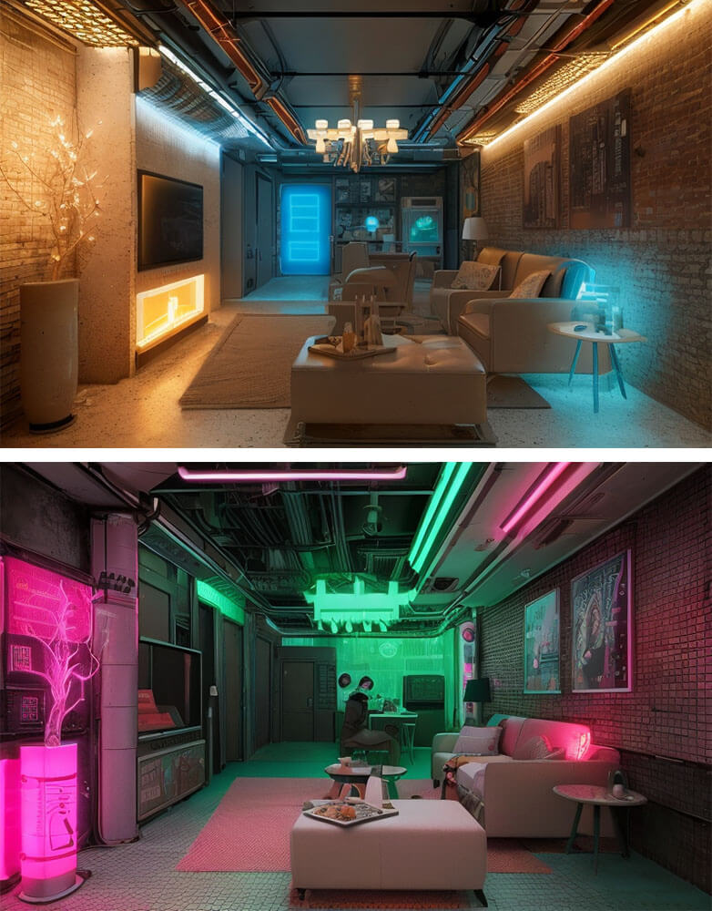 拍摄自家的客厅照,通过seg模型转换为赛博朋克风格