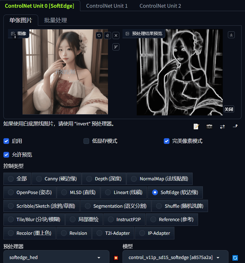 如果我们需要让AI更多的发挥空间,让线条更宽松一些,这里我们就引入了SoftEdge预处理及模型
