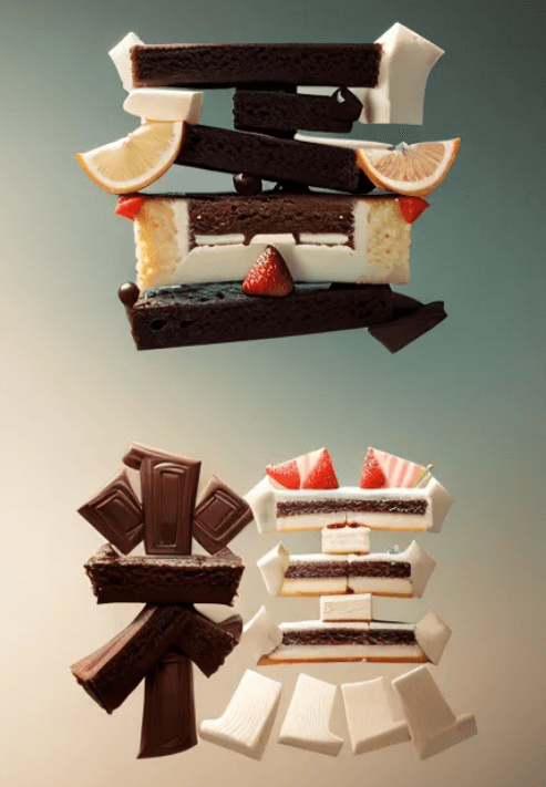 参考:正向提示词中包含“蛋糕”、“水果”、“巧克力”“奶油”
